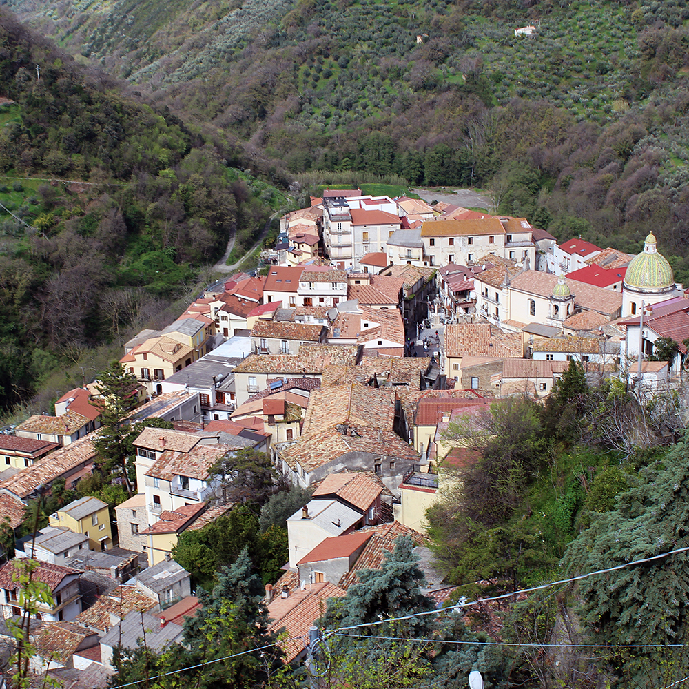 Tirreno, sulle falde del monte Reventino, con il centro storico circondato dai